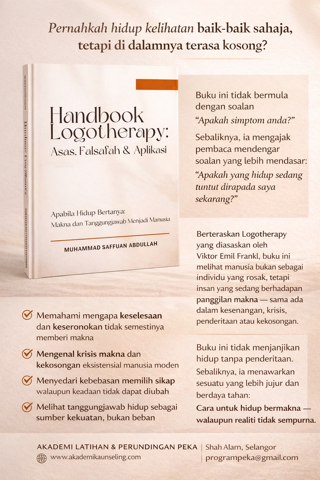 Berteraskan pemikiran Viktor Emil Frankl, buku ini membawa pembaca melangkaui teknik semata-mata, kepada pemahaman mendalam tentang manusia sebagai insan yang bebas, bertanggungjawab dan sentiasa dipanggil untuk memberi jawapan kepada kehidupan.